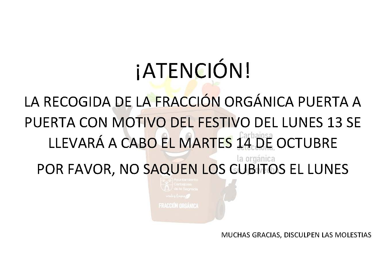 Con motivo de la festividad del lunes 13 de octubre, la recogida puerta a puerta de los residuos orgánicos se realizará el martes 14 de octubre.